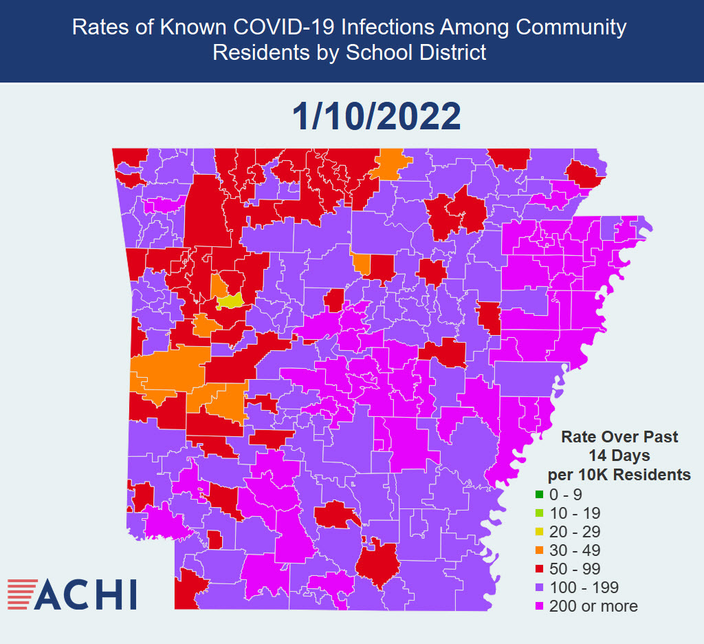 In a Thursday afternoon press release, the Arkansas Center for Health Improvement released that a total of 226 Arkansas public school districts, or 97 percent of the state’s 234 contiguous school districts, have Covid-19 infection rates of 50 or more new known infections per 10,000 district residents over a 14-day period, as the ACHI cited its analysis of Arkansas Department of Health data current as of Monday.