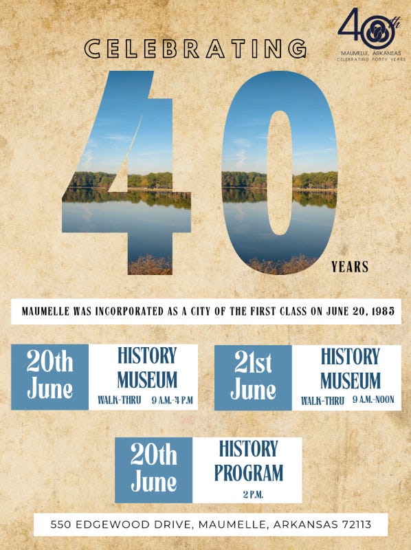 Maumelle City Hall will be hosting a day of celebration on Friday, June 20 as the city celebrates its 40th birthday. The event will give visitors the opportunity to “walk through history” with a 2 p.m. program in the council chambers where there will be speakers, and proclamations, among other things.