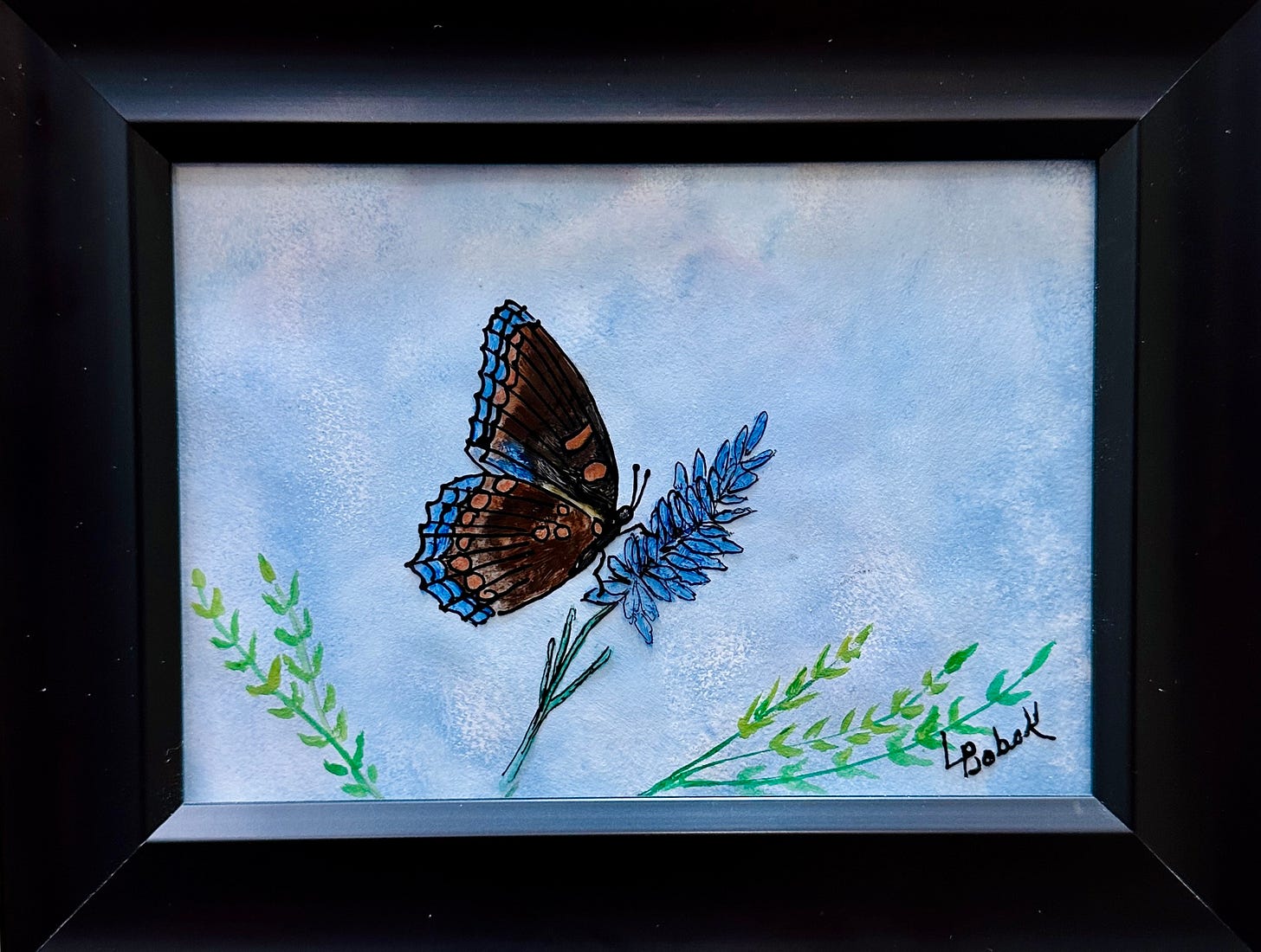 Her subject matter ranges from wildlife, natural scenery, and seascapes to pet portraits. She paints in oil, acrylic and watercolor on canvas, cedarwood, and on glass in reverse. Locally her best selling pieces are trout and turkeys painted on cedarwood. Reverse glass painting is almost a dying art, yet she continues to enjoy this method, shown here, the “Red Dot Butterfly.’