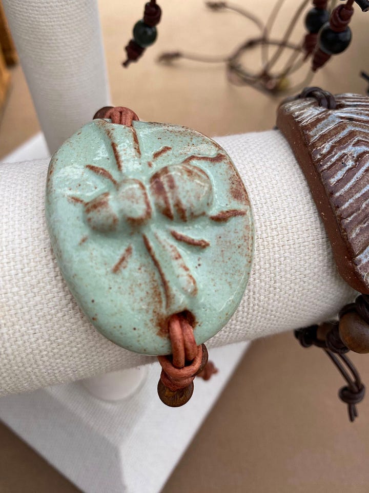 Among the artisans are Dana Finimore, at Rare Birds Studio, who makes functional and art pottery, Metalsmith Cindy Kopack, with Whippoorwill Mountain Jewelry, has a selection of hammered silver, copper and brass earrings, necklaces and bracelets, some combined with precious stones. Master glass artists Tom and Sage Holland, Glass Beadmakers, bring colorful flame-worked bead jewelry and sculptural pieces to share with the public. Michael and Ethan Hicks, ro’ark leather return to the Market with hand-stitched leather bags and wallets.