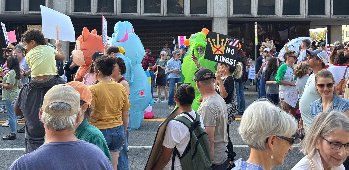 A crowd estimated at between 2,000 and 3,000 people gathered peacefully and exercised their constitutional rights. Some of that crowd was also there for the Downtown Pride Parade that went from the Federal Building to the state capitol. Most of the attendees at No Kings walked in the Pride Parade as well.