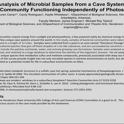 A team of six Henderson State University biology students are on a mission to examine and analyze mysterious microbes found deep underground in a unique Tennessee cave. For the past two years, they have been using metagenomic DNA sequencing to identify microbes from a “petroleum pond” found in the cave.