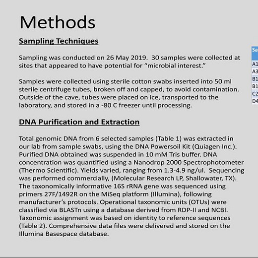 To date, the students have identified 593 different microbes. While some are common, and would be expected in most caves, others are unique and have the ability to metabolize methane, sulfur compounds, ammonia, and hydrocarbons, Engman said.