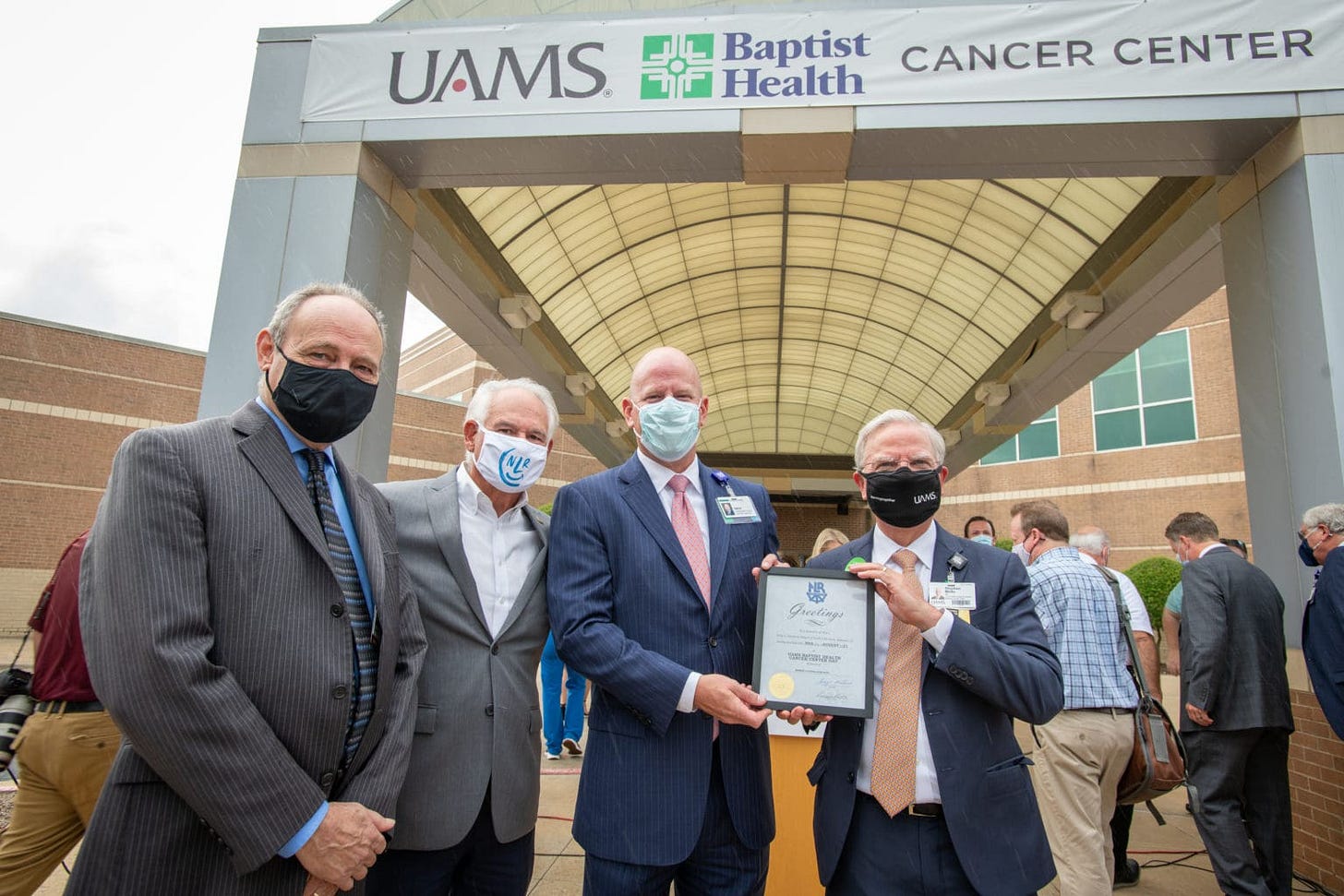 UAMS Winthrop P. Rockefeller Cancer Institute Director Dr. Michael Birrer, North Little Rock Mayor Terry Hartwick, Baptist Health CEO Troy Wells and UAMS Senior Vice Chancellor and Medical Center CEO Dr. Steppe Mette. (UAMS Photo)
