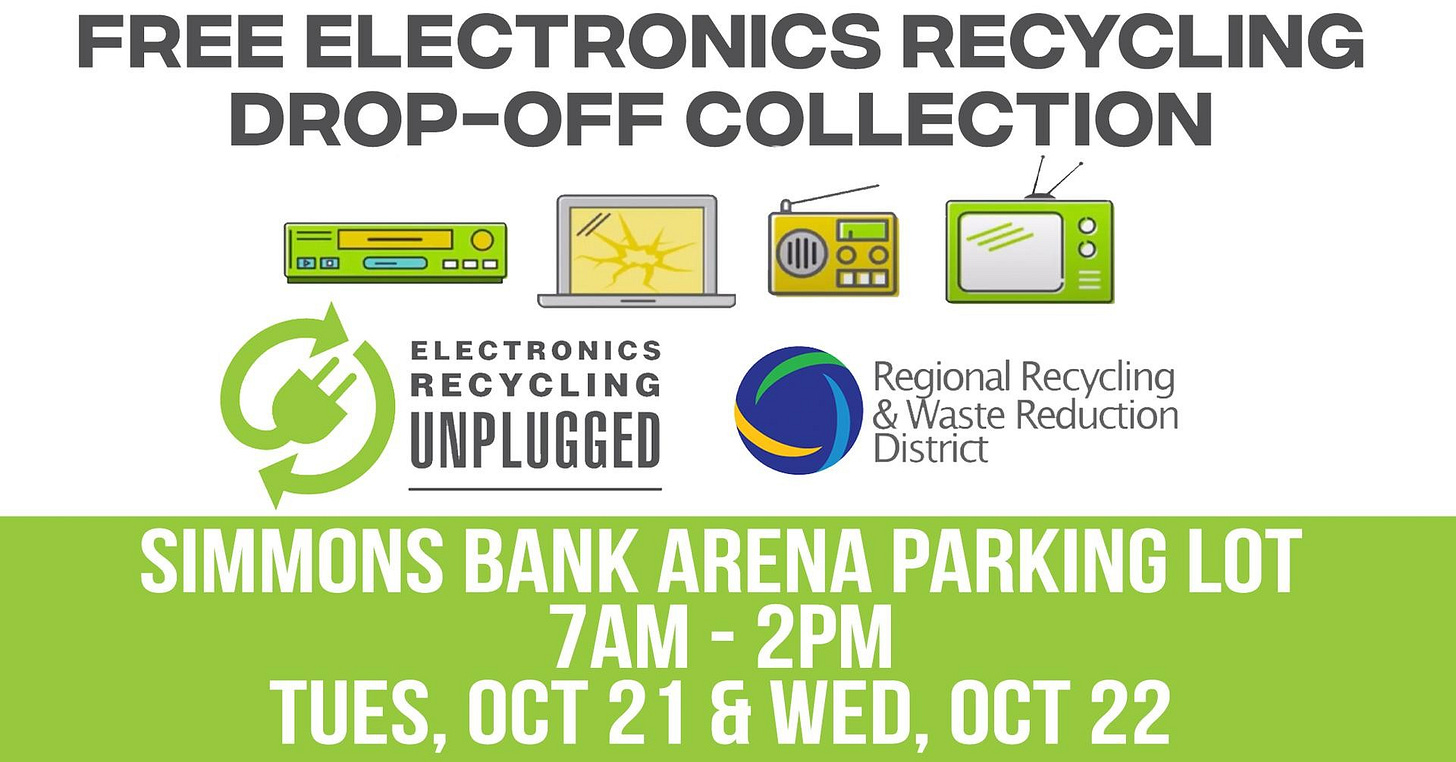 A free electronics recycling event will be held next Tuesday and Wednesday, Oct. 21 and Oct. 22, in the parking lot of Simmons Bank Arena in downtown North Little Rock. It is scheduled to start at 7 a.m. and end at 2 p.m. each day.