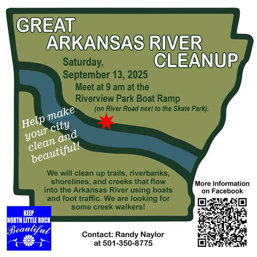 EVENTS: The Great Arkansas River Clean-up is this Saturday and scheduled to start at 9 a.m. Volunteers are needed and those interested should meet at the Riverview Park Boat Ramp located on River Road in North Little Rock next to the Skateboard Park. Contact Randy Naylor at 501-350-8775 for more information. Or check out the flyer below.