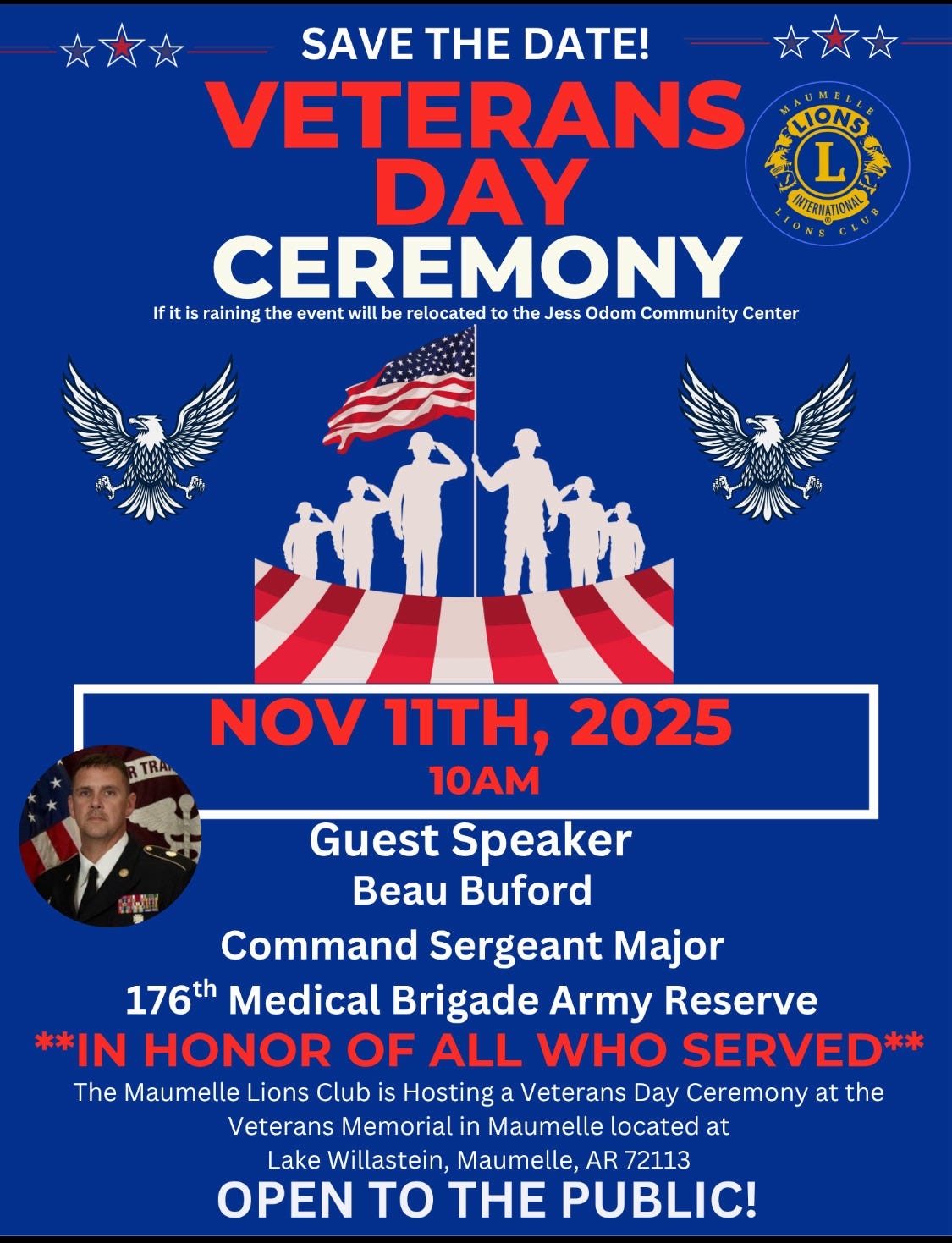 Maumelle: The Maumelle Area Lions Club will be hosting its annual Veterans Day event at Lake Willastein starting at 10 a.m. on Tuesday. The rain location is the Jess Odom Community Center. Speaking will be Beau Buford and for more details, click the flyer below.