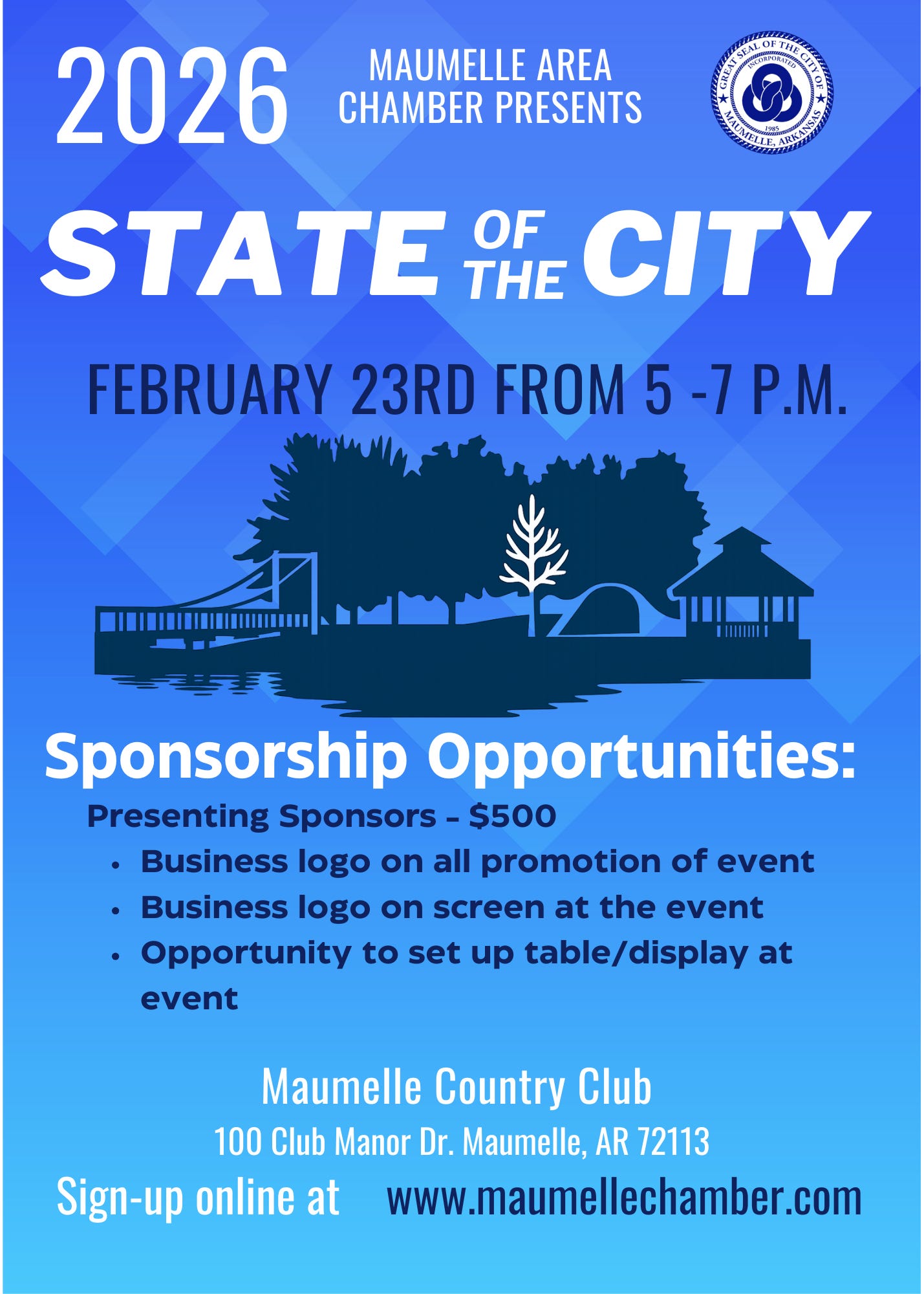 The Maumelle Area Chamber of Commerce and the city of Maumelle will be having an event at the Maumelle Country Club on Monday, Feb. 23 and the State of the City will be delivered by Mayor Caleb Norris.