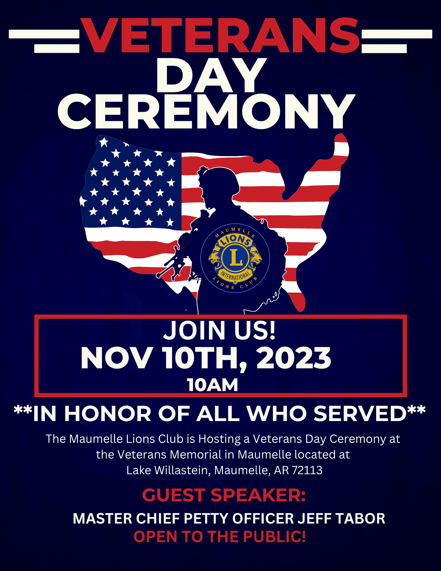 The Maumelle Area Lions Club will have a Veterans Day ceremony at 10 a.m. on Friday at the Veterans Memorial at Lake Willastein, seen below.